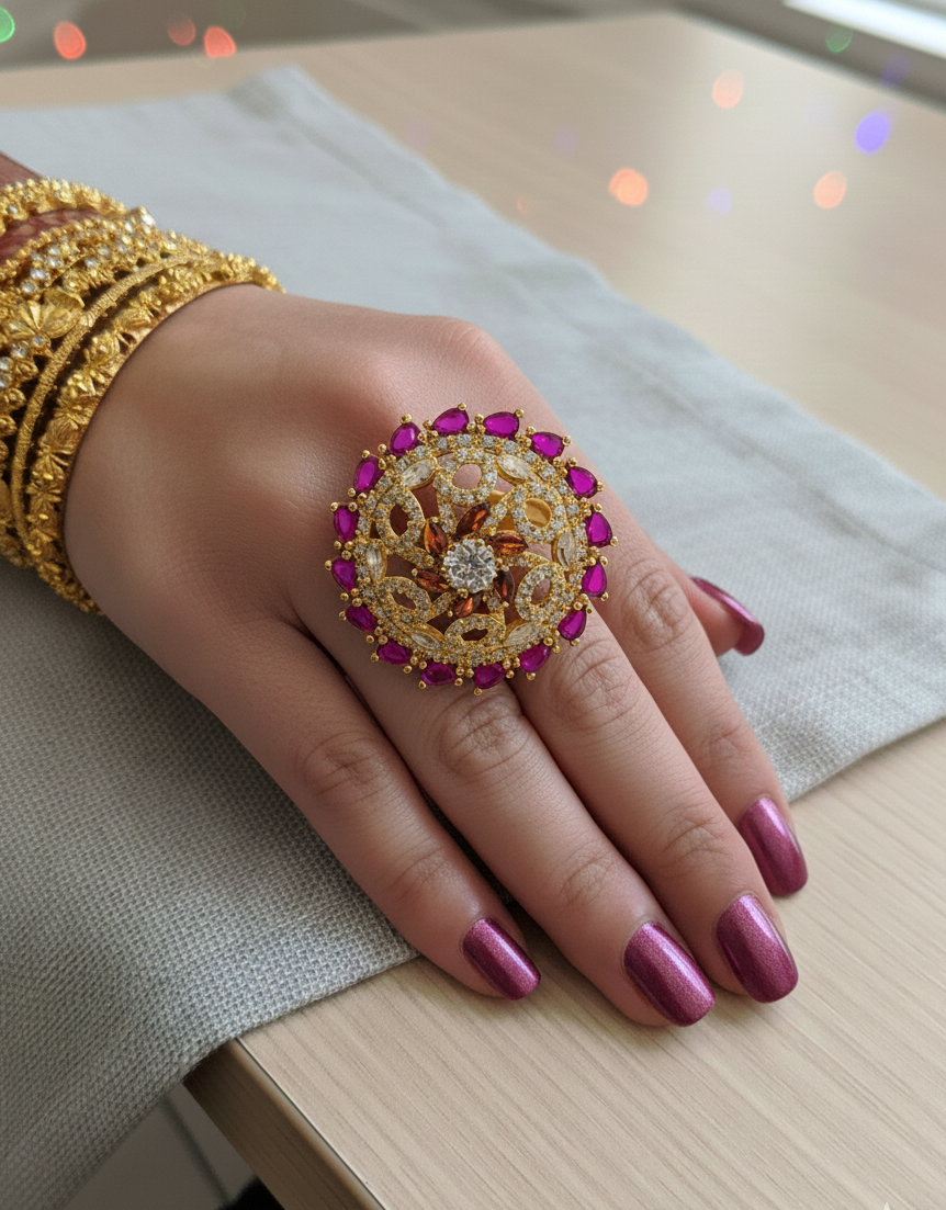 This exquisite ring features a circular design with a sparkling central stone, surrounded by vibrant orange accents and a halo of pink gemstones. Crafted in detailed gold filigree, its adjustable band ensures a perfect fit for any finger. A stunning choice for traditional celebrations or standout style.