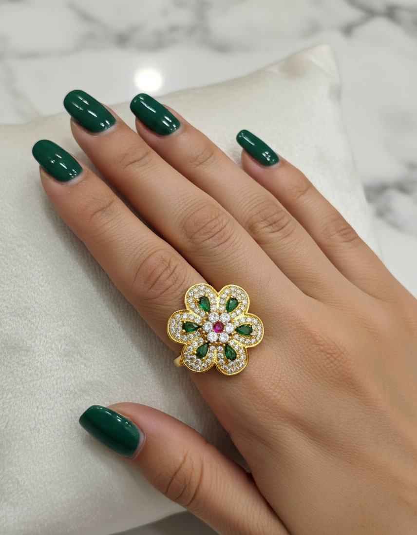 This elegant flower-shaped ring features a gold base with intricate detailing, white petal-like stones, green teardrop accents, and a striking central pink gemstone. Its adjustable band ensures a comfortable fit, making it a versatile piece for festive occasions or statement styling.