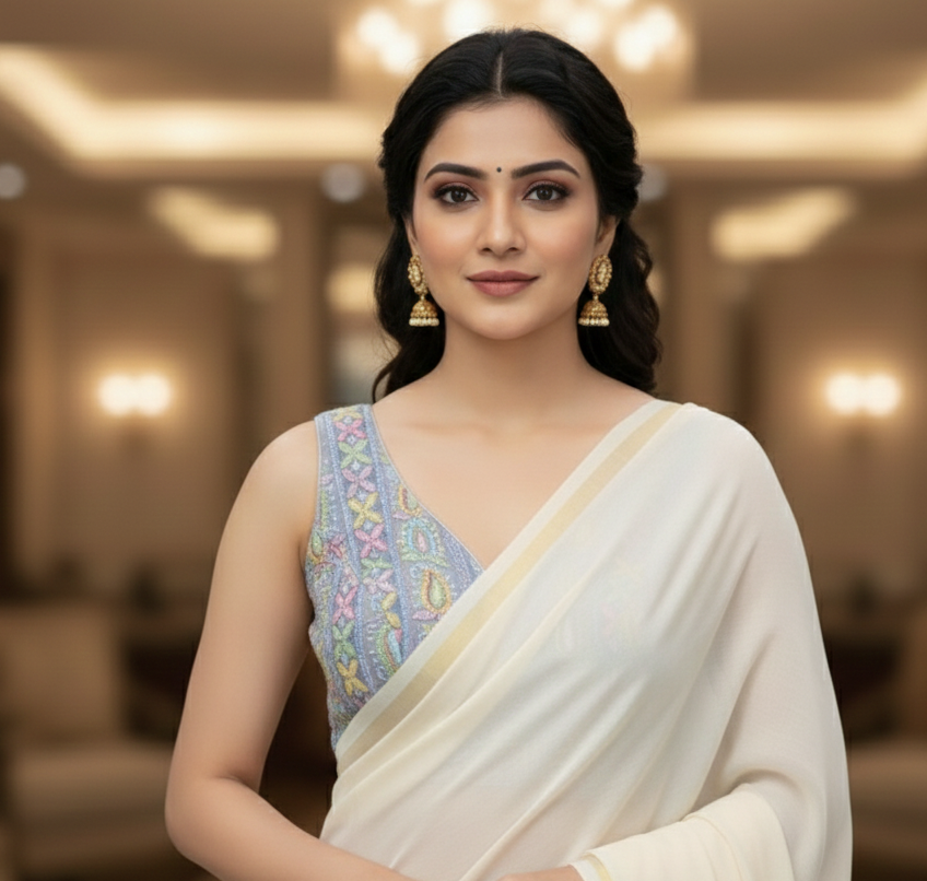 Fabric: Premium Silk-Blend with intricate threadwork and subtle sequin highlights.