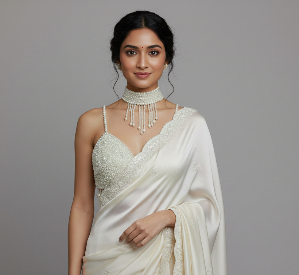 The Choker: A coordinated, high-neck pearl choker that mirrors the blouse’s design. It includes intricate latticework and cascading pearl strands that create a “necklace” effect, eliminating the need for additional jewelry.
