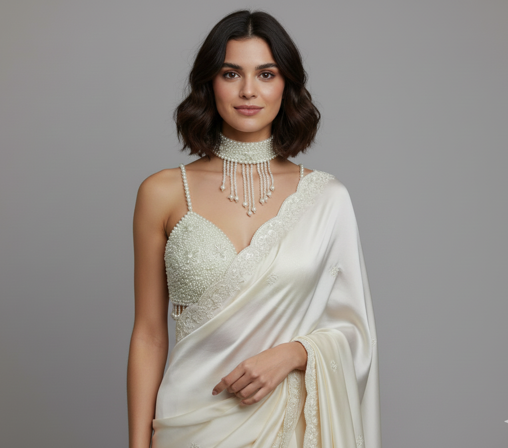 This pearl-embellished blouse and matching choker set is a masterclass in modern ethnic glamour. It combines the traditional craftsmanship of pearl embroidery with a contemporary, daring silhouette.