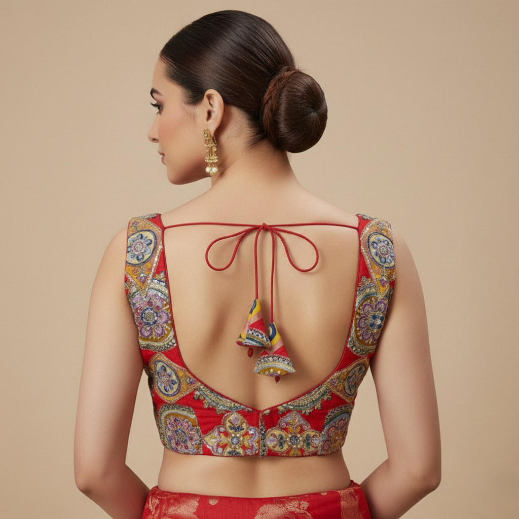 Elevate your ethnic wardrobe with this striking red blouse, a perfect fusion of traditional artistry and contemporary style. A vibrant red base adorned with intricate multi-colored circular and diamond-shaped “mandala” motifs. This piece is designed to be the focal point of any festive ensemble.