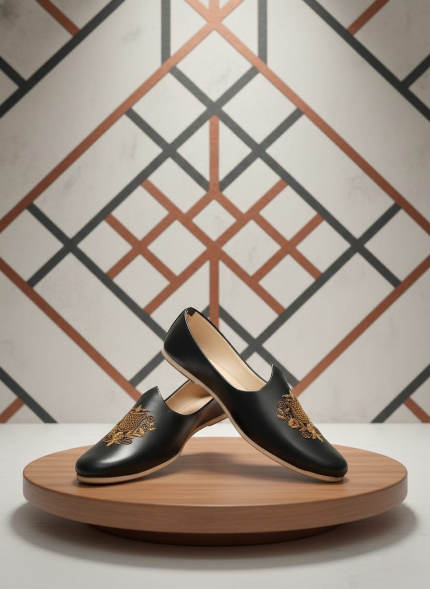 Step into luxury with these handcrafted black leatherette juttis. Featuring a striking gold-toned embroidered crest, these shoes offer a regal touch to any ethnic ensemble. The clean, matte finish and minimalist silhouette make them a versatile masterpiece for weddings and formal celebrations.
