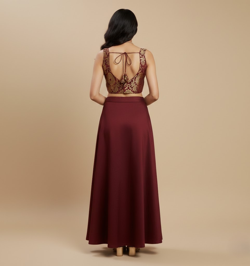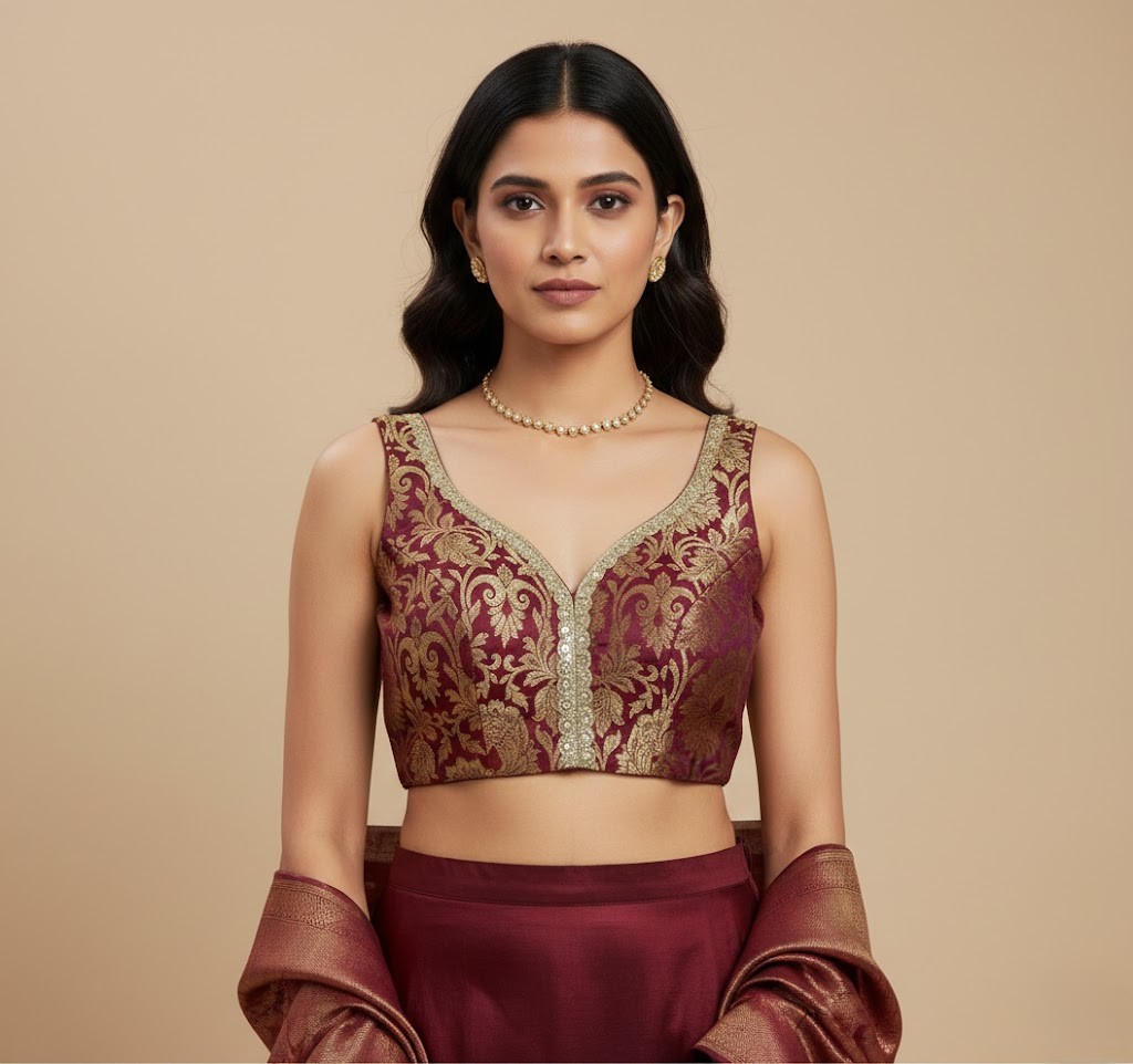 This elegant, maroon and gold brocade blouse is a perfect blend of traditional craftsmanship and contemporary silhouette, designed to add a regal touch to any ethnic ensemble. Sleeveless and cropped to sit perfectly above the waist, making it ideal for pairing with high-waisted lehengas or sarees.