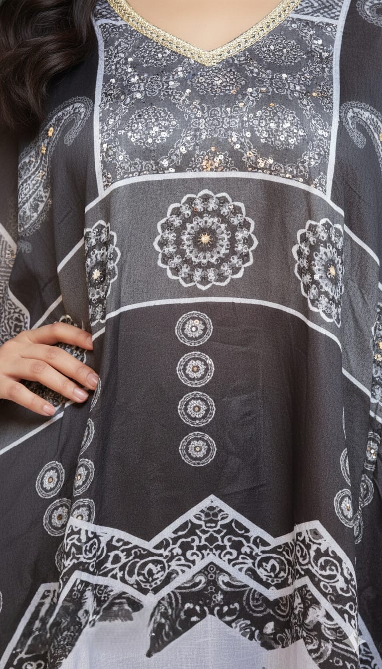 A masterpiece of contrast, this black-based kaftan showcases a rich tapestry of grey and white prints. The relaxed, sleeve silhouette is grounded by architectural borders and a metallic gold finish.
