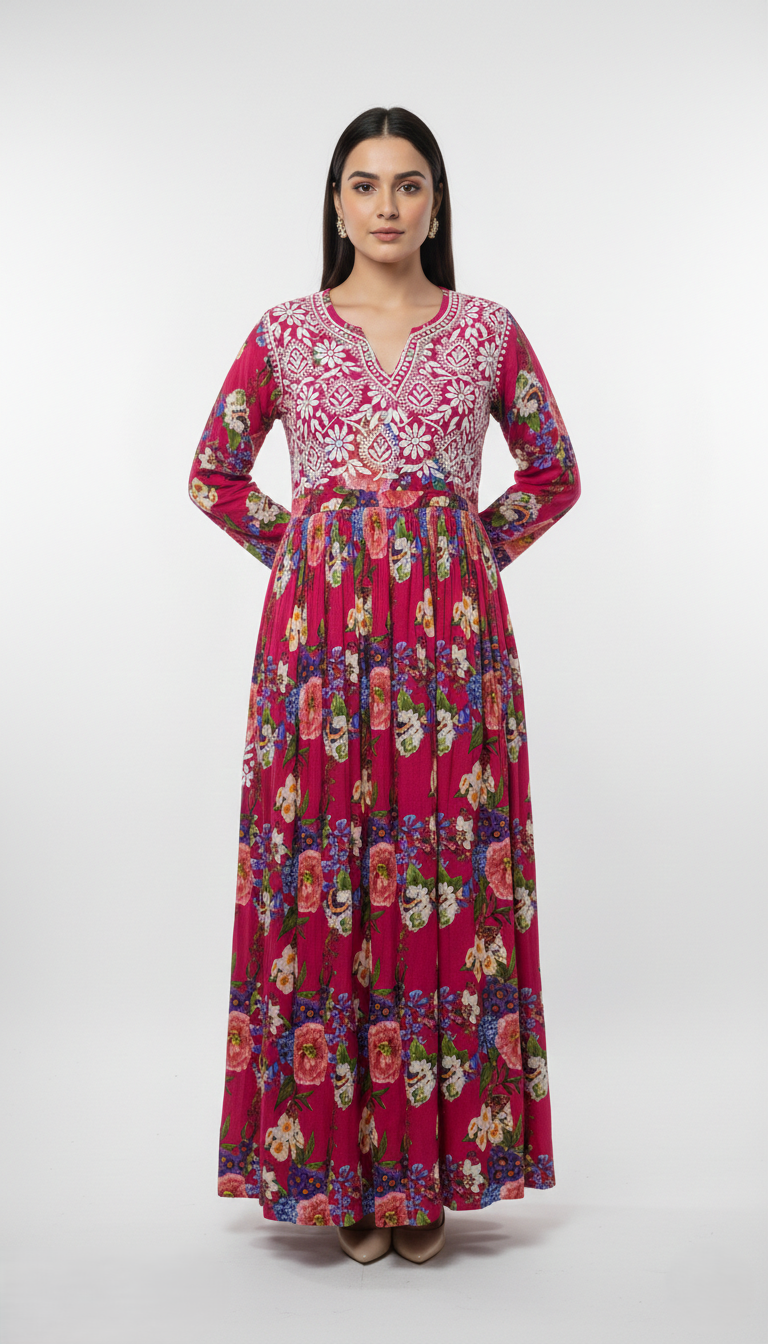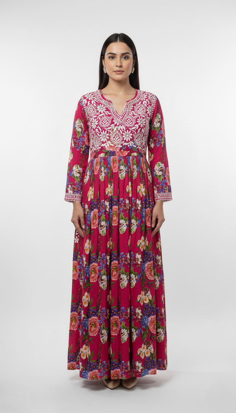 Step into a garden in full bloom with our Fuchsia Flora Chikankari, a masterpiece that celebrates the timeless art of Lucknowi Chikankari. Set against a canvas of striking fuchsia pink, this ensemble bridges the gap between heritage craft and modern floral charm.